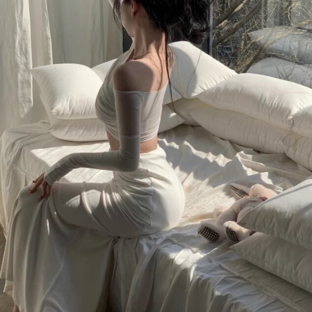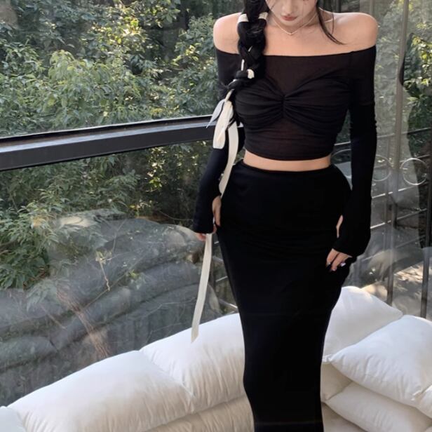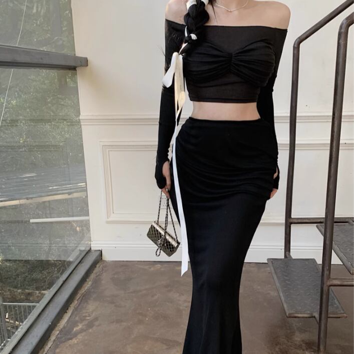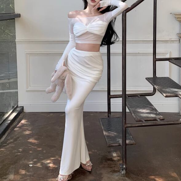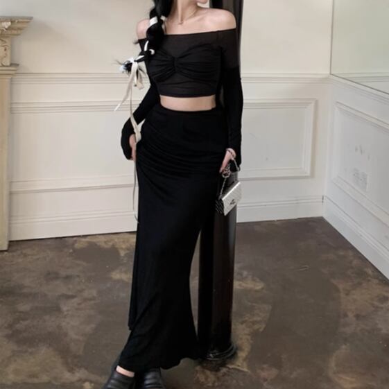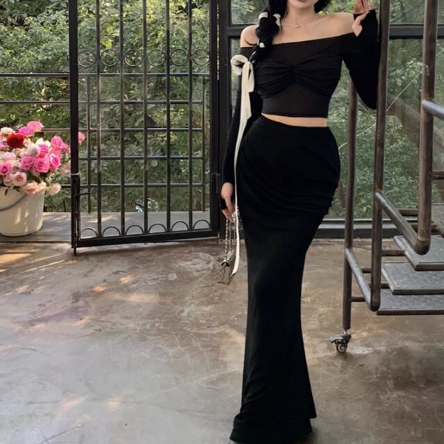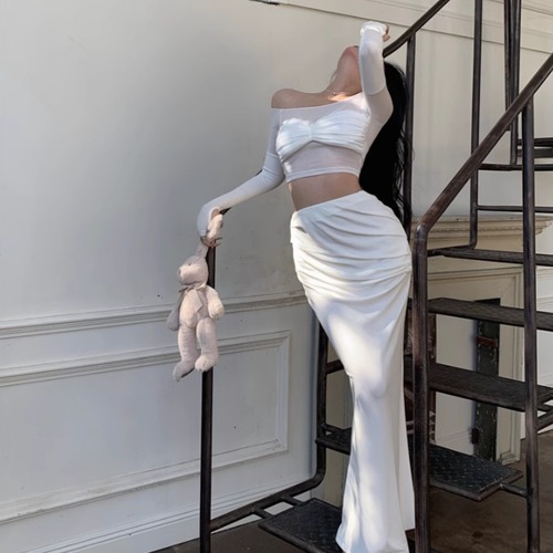 【2点セット】3色/フーディーカシュクールトップス+マーメイドスカート ・12506