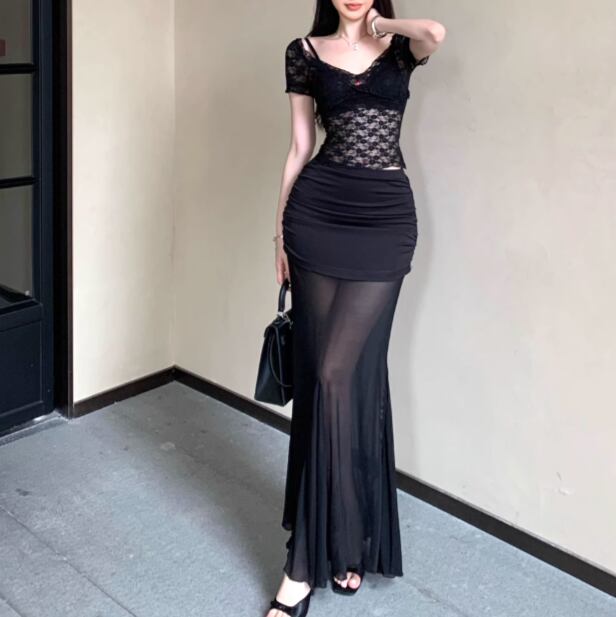 【2点セット】3色/フーディーカシュクールトップス+マーメイドスカート ・12506