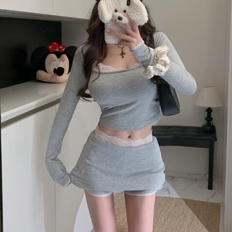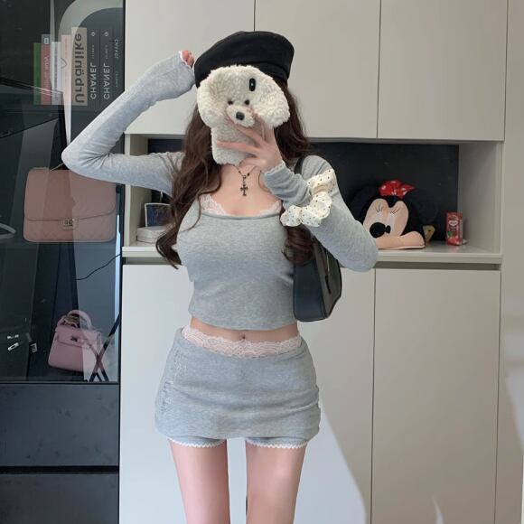 【3点セット】レースブラレット+オフショルトップス+レースヘムスカート ・12766