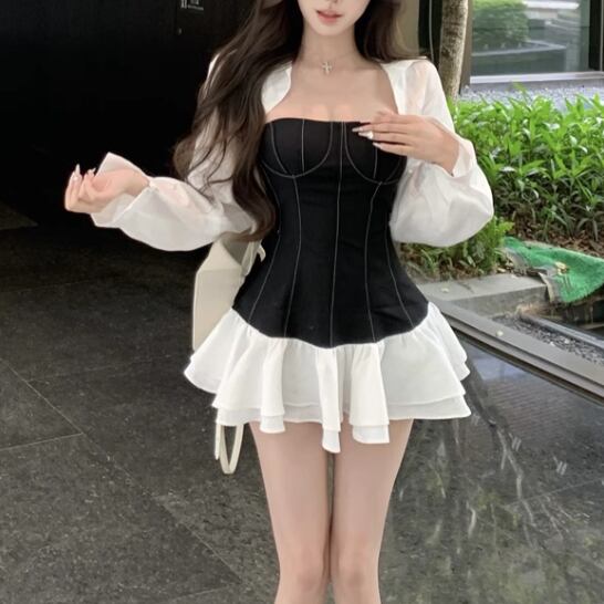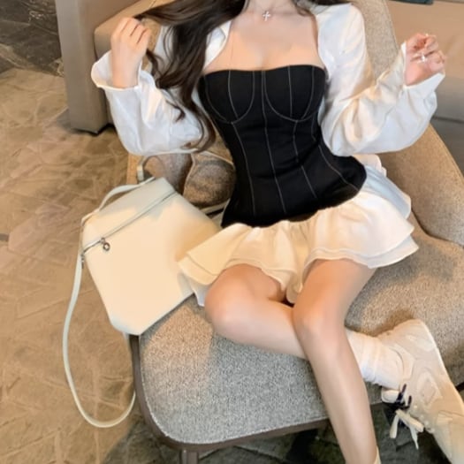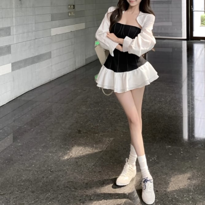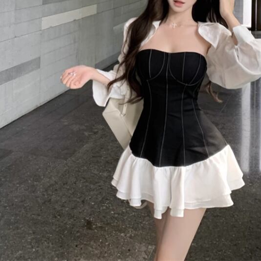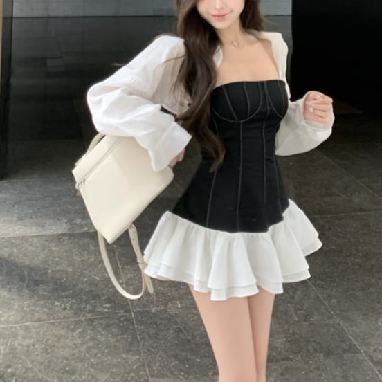 【2点セット】3色/フーディーカシュクールトップス+マーメイドスカート ・12506