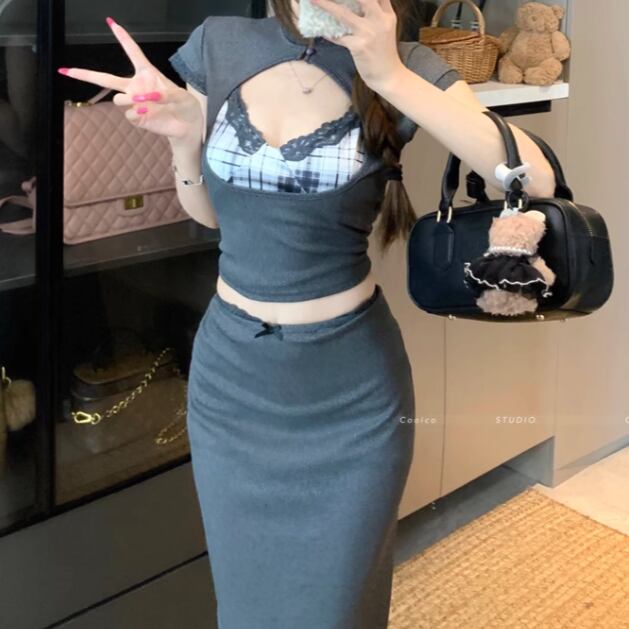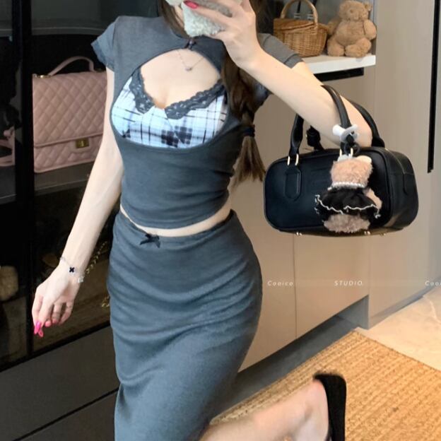 【2点セット】3色/フーディーカシュクールトップス+マーメイドスカート ・12506