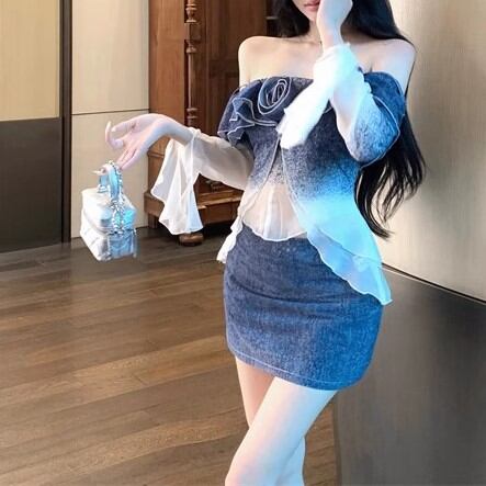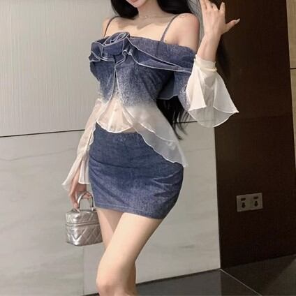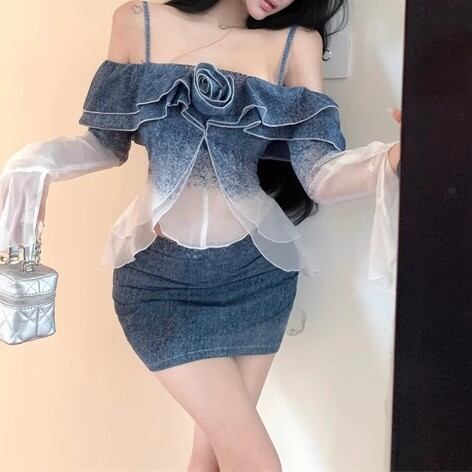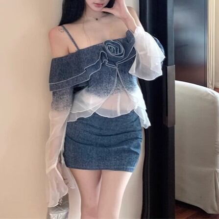 【3点セット】レースブラレット+オフショルトップス+レースヘムスカート ・12766