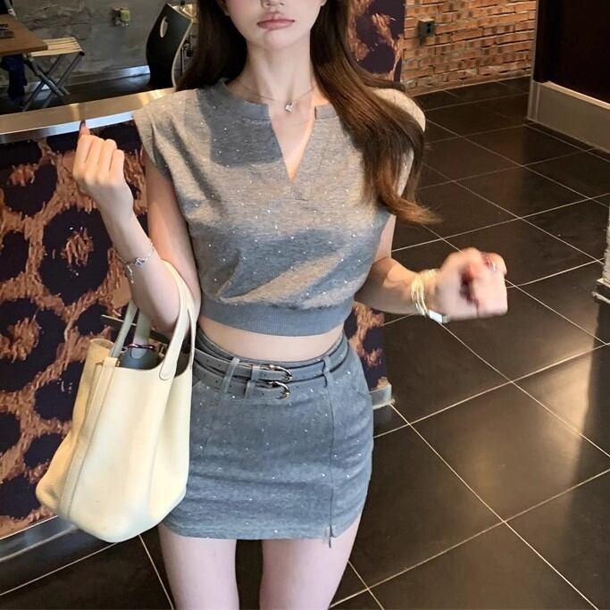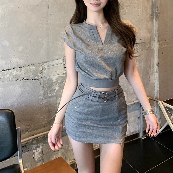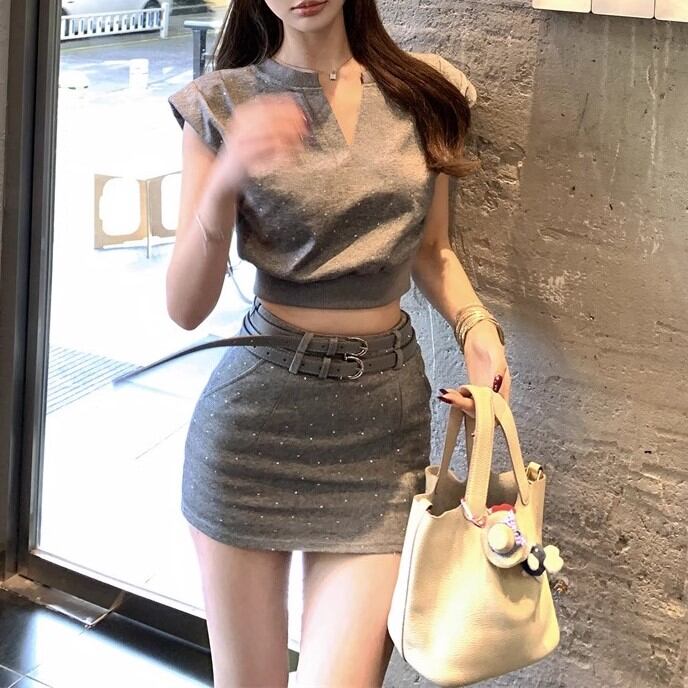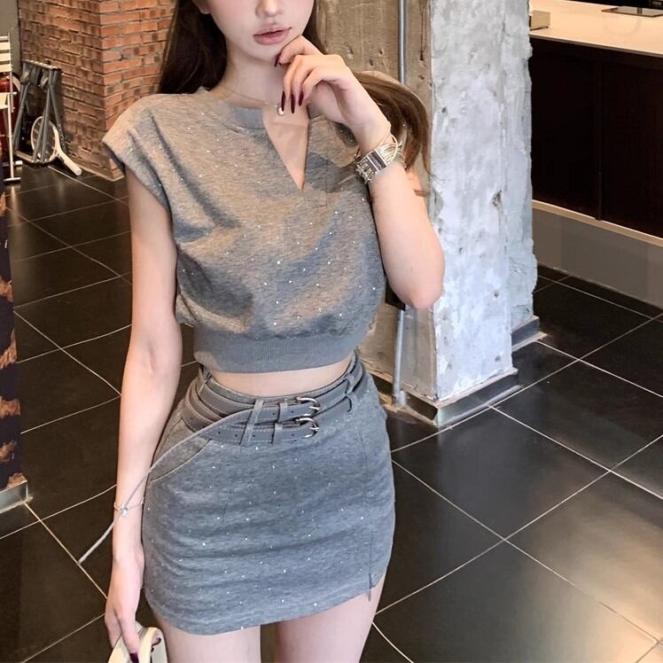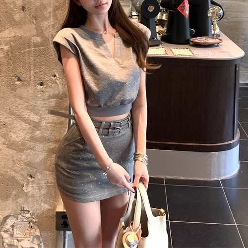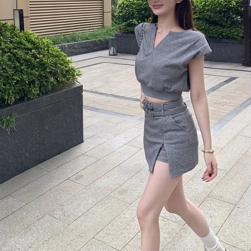 【2点セット】3色/フーディーカシュクールトップス+マーメイドスカート ・12506