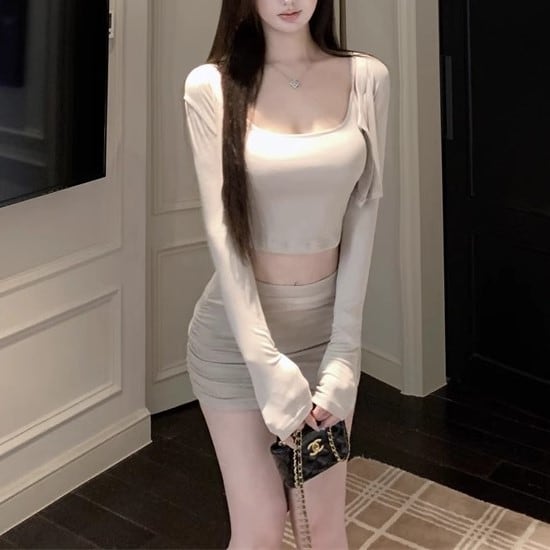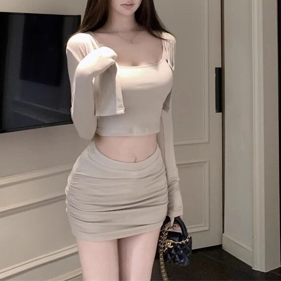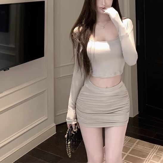 【2点セット】3色/フーディーカシュクールトップス+マーメイドスカート ・12506