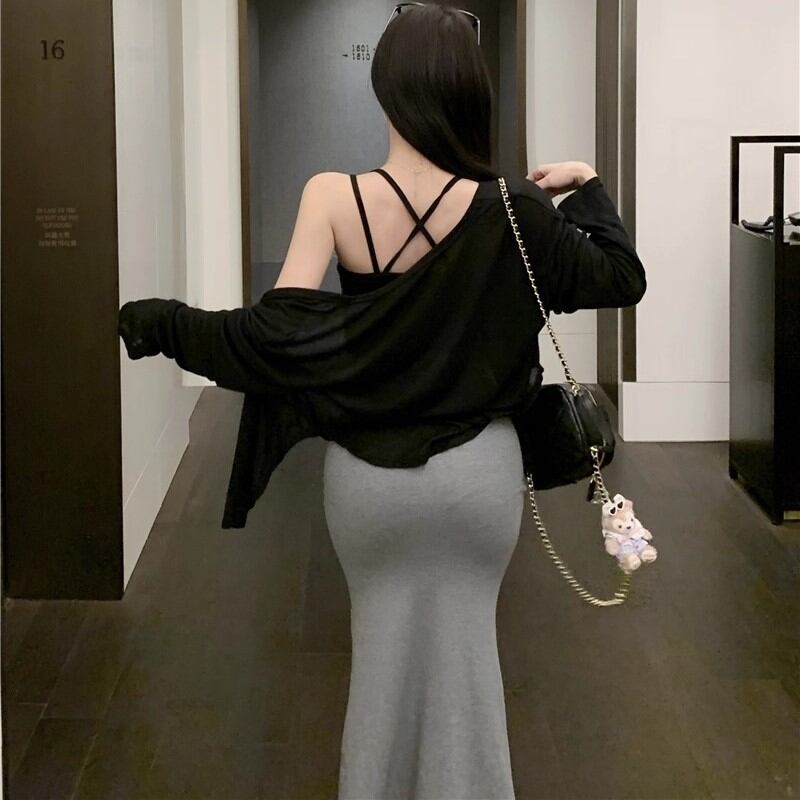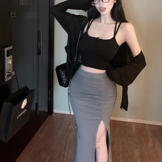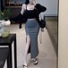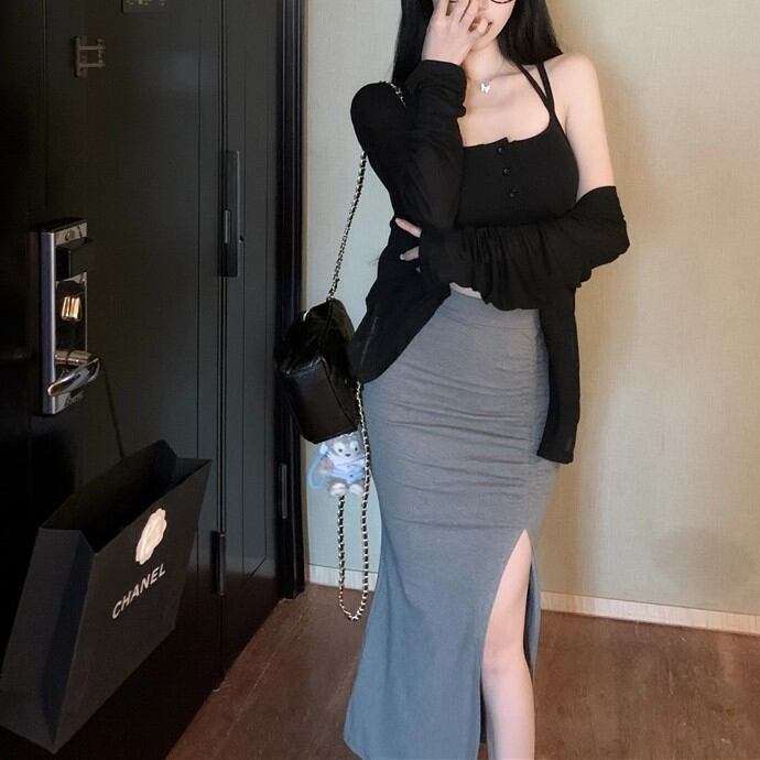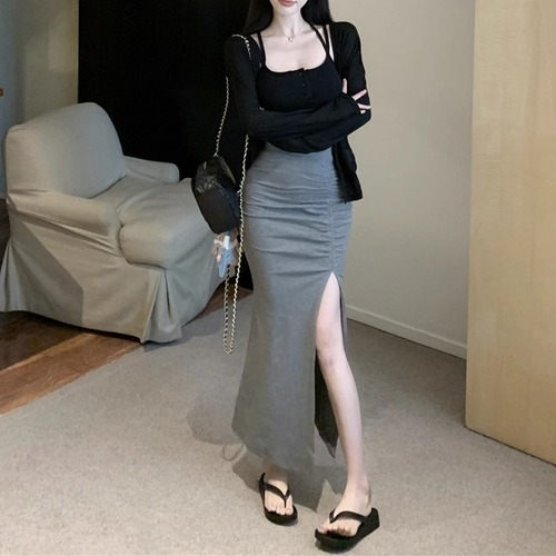 【2点セット】3色/フーディーカシュクールトップス+マーメイドスカート ・12506