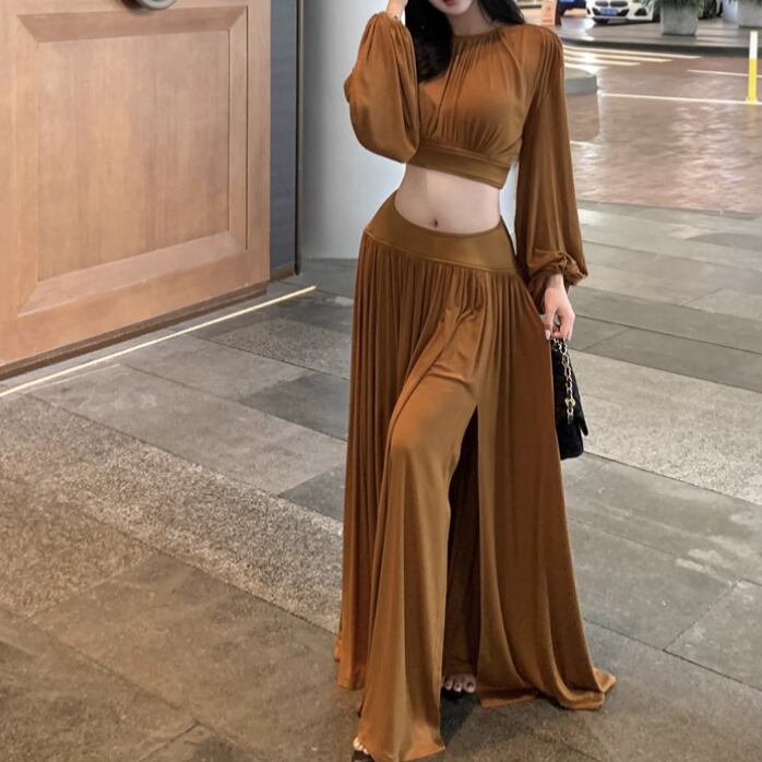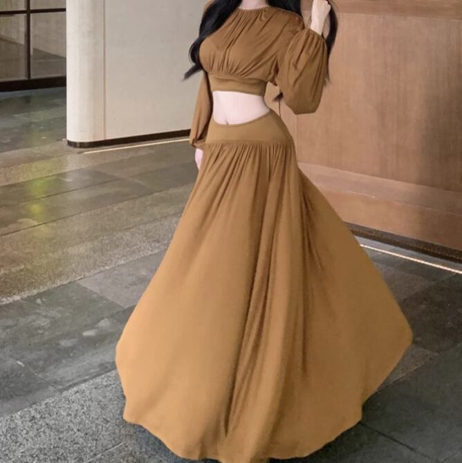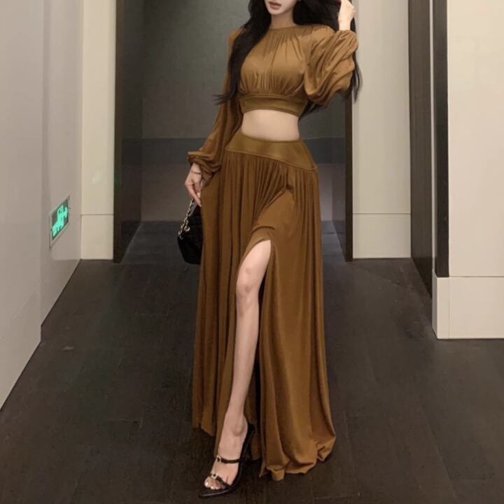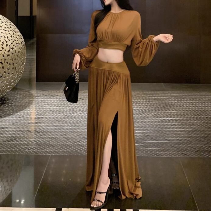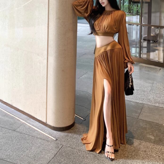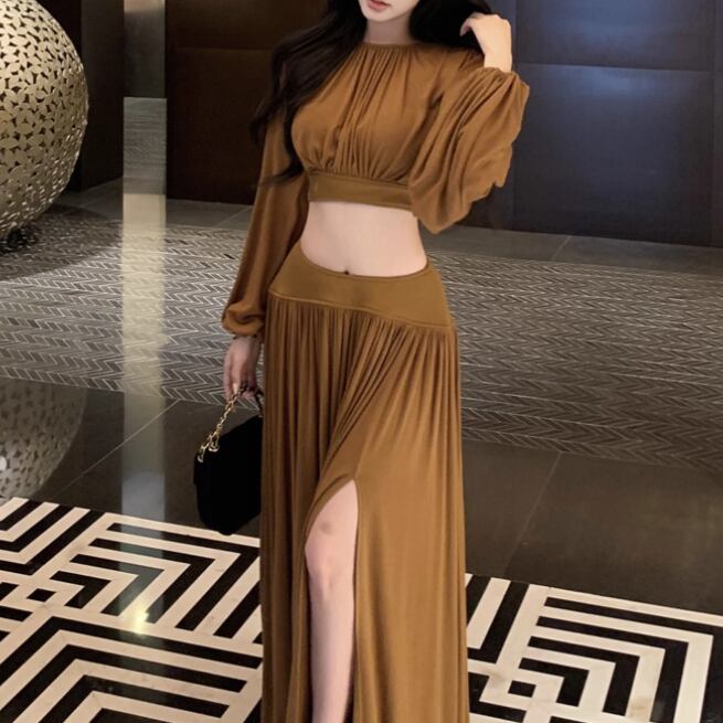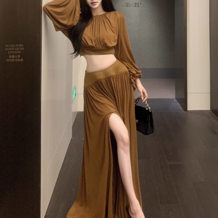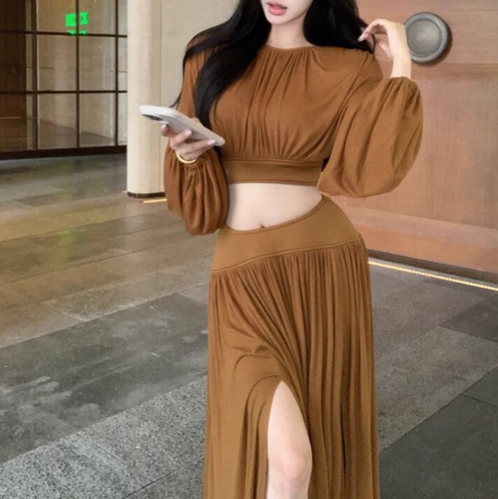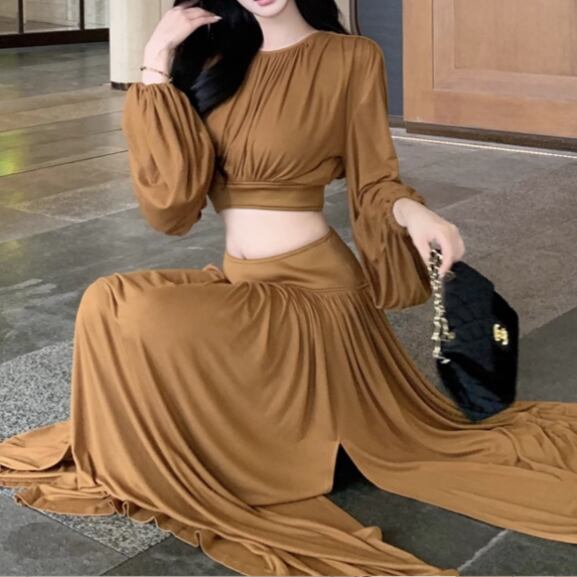 【2点セット】3色/フーディーカシュクールトップス+マーメイドスカート ・12506