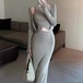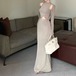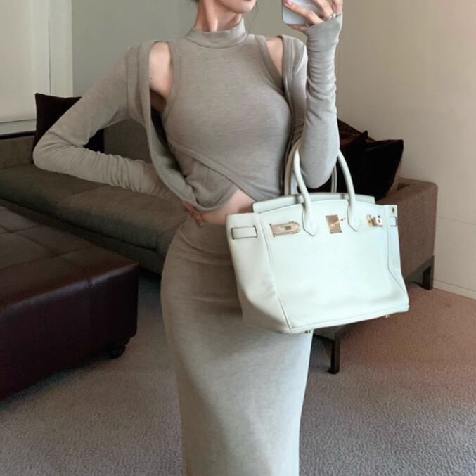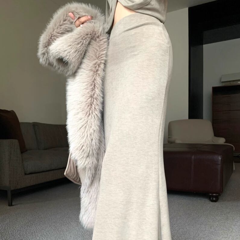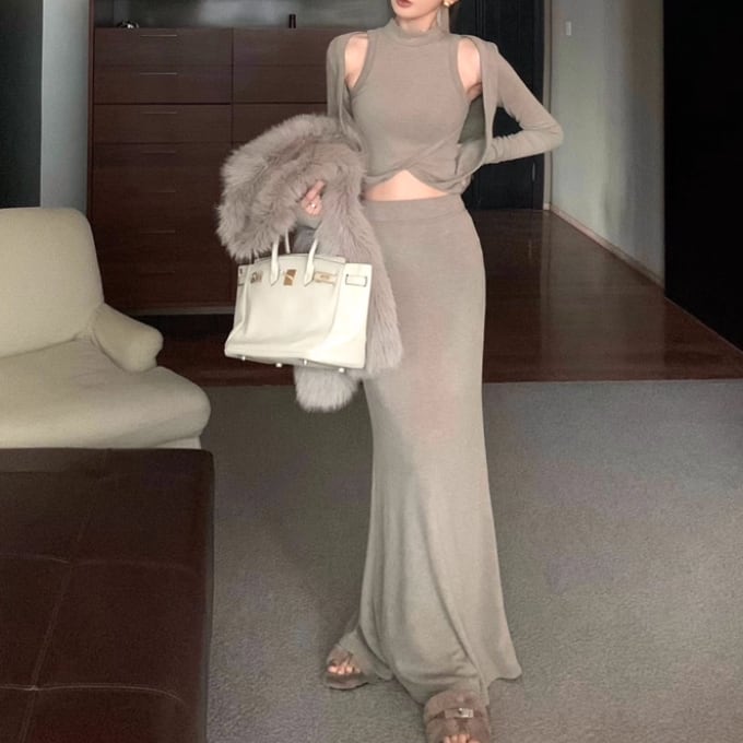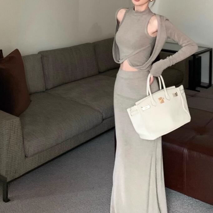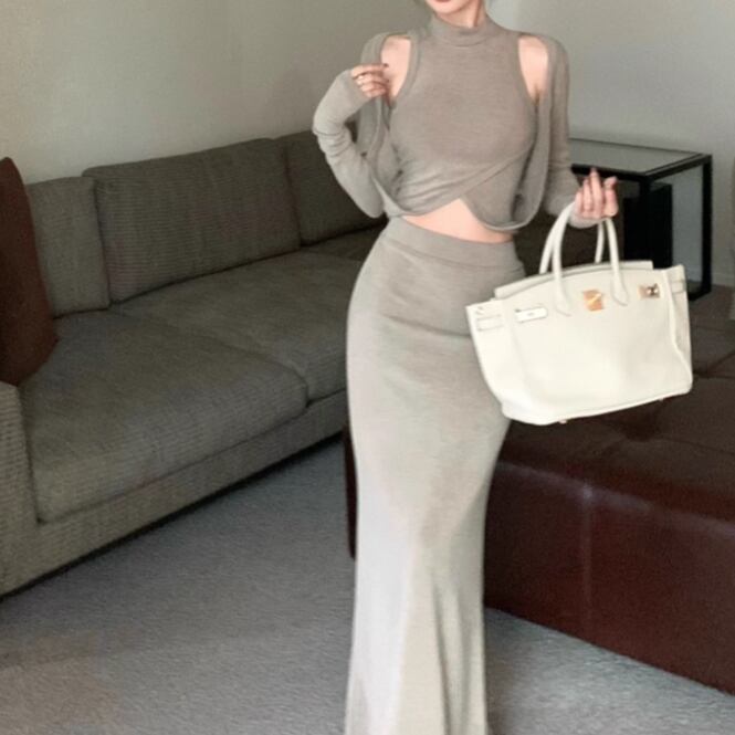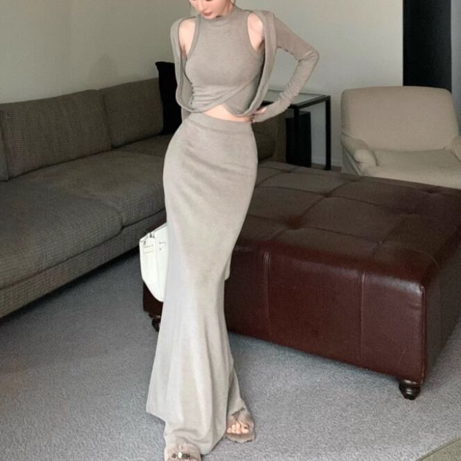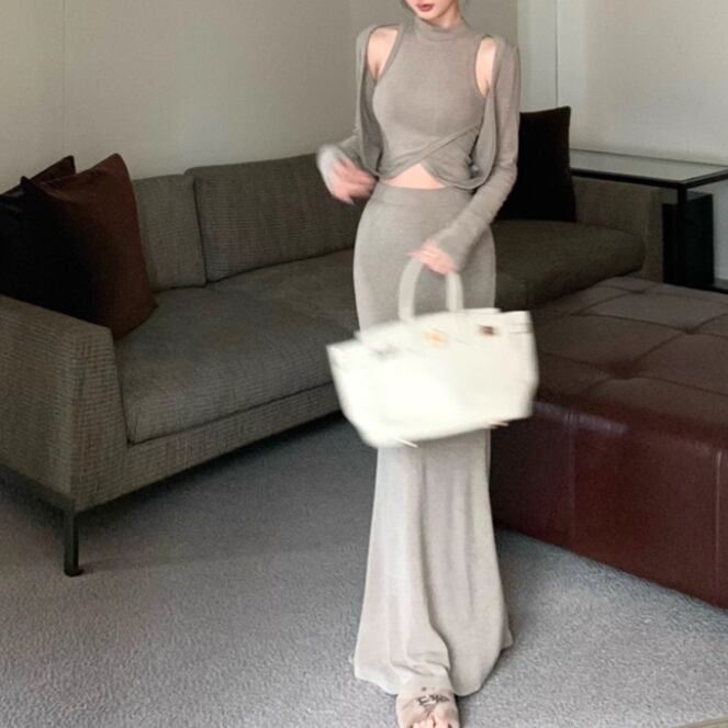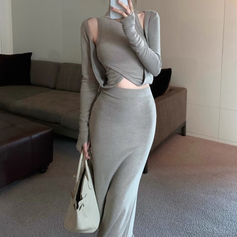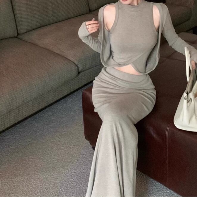 【2点セット】3色/フーディーカシュクールトップス+マーメイドスカート ・12506