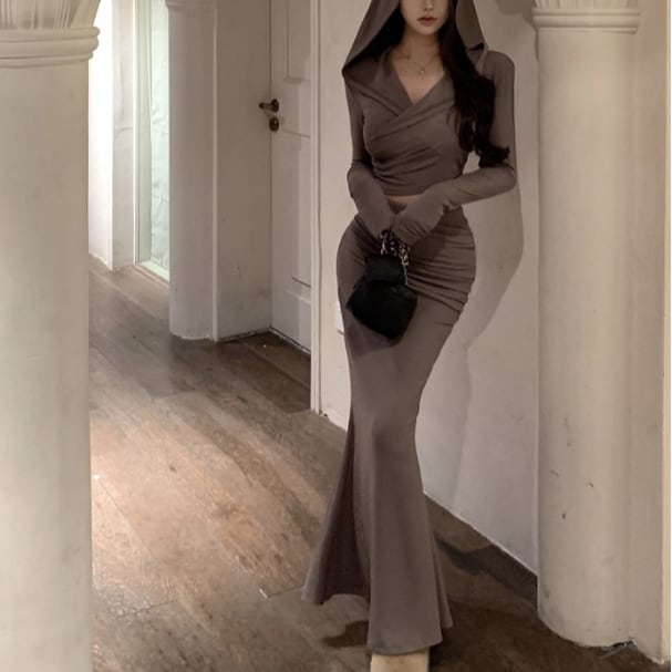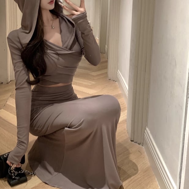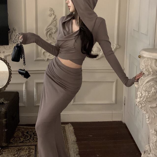 【2点セット】2色/ハイネックホルタートップス+プリーツスカート ・7456