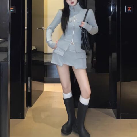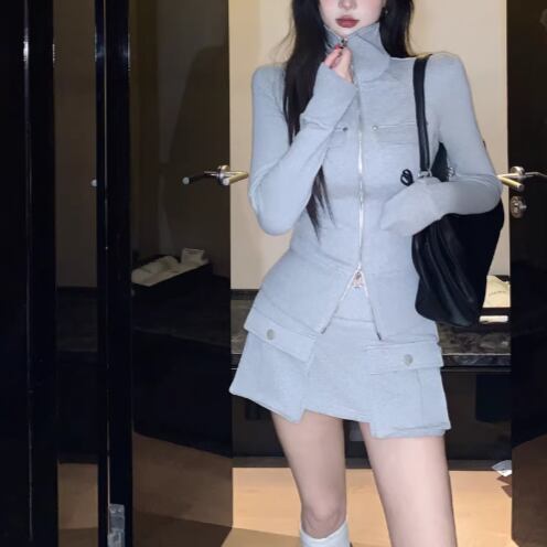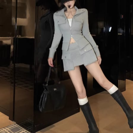 【2点セット】3色/フーディーカシュクールトップス+マーメイドスカート ・12506