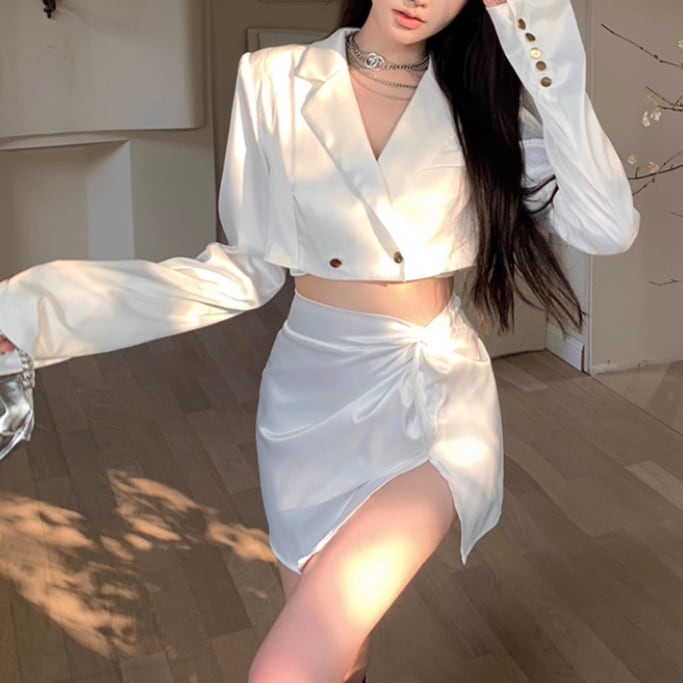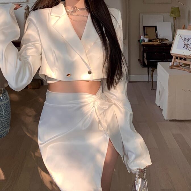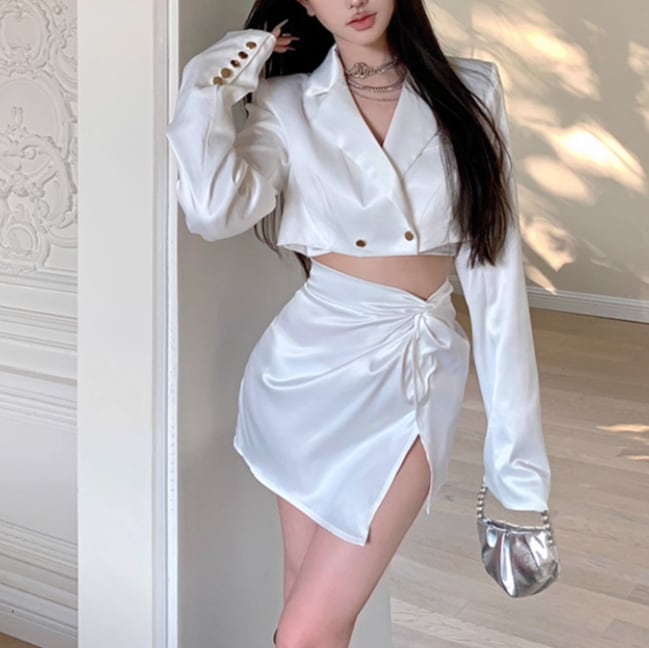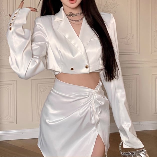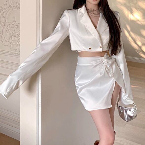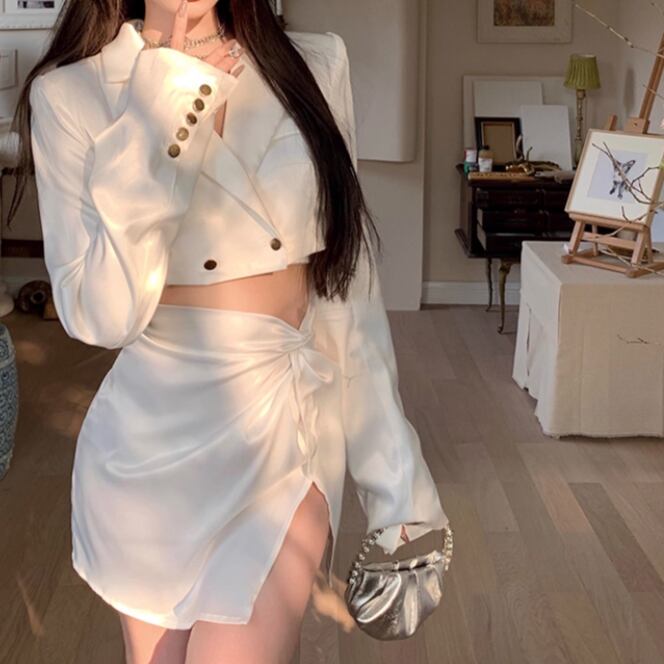 【2点セット】3色/フーディーカシュクールトップス+マーメイドスカート ・12506