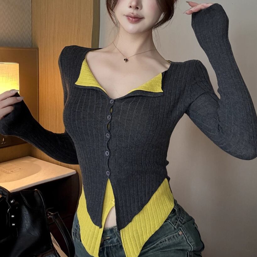 3色/ファーカラーレースアップコンビトップス ・12904