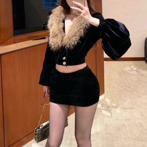 【2点セット】3色/フーディーカシュクールトップス+マーメイドスカート ・12506