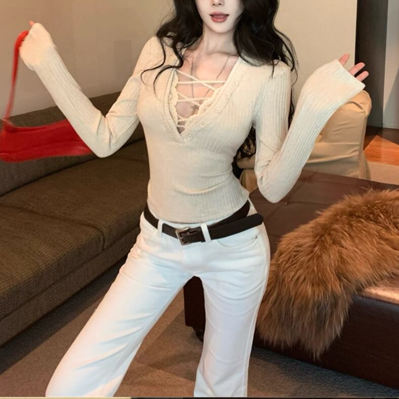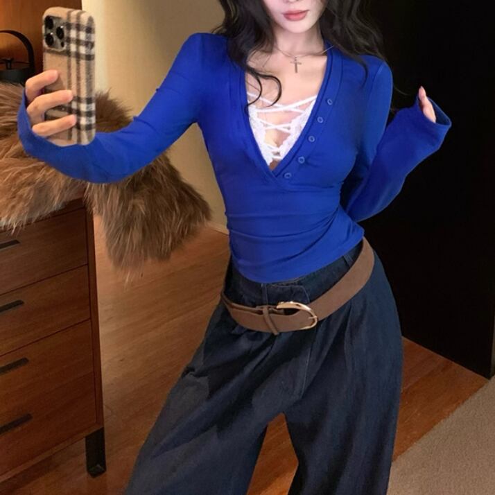 3色/ファーカラーレースアップコンビトップス ・12904