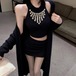 【2点セット】2色/ハイネックホルタートップス+プリーツスカート ・7456