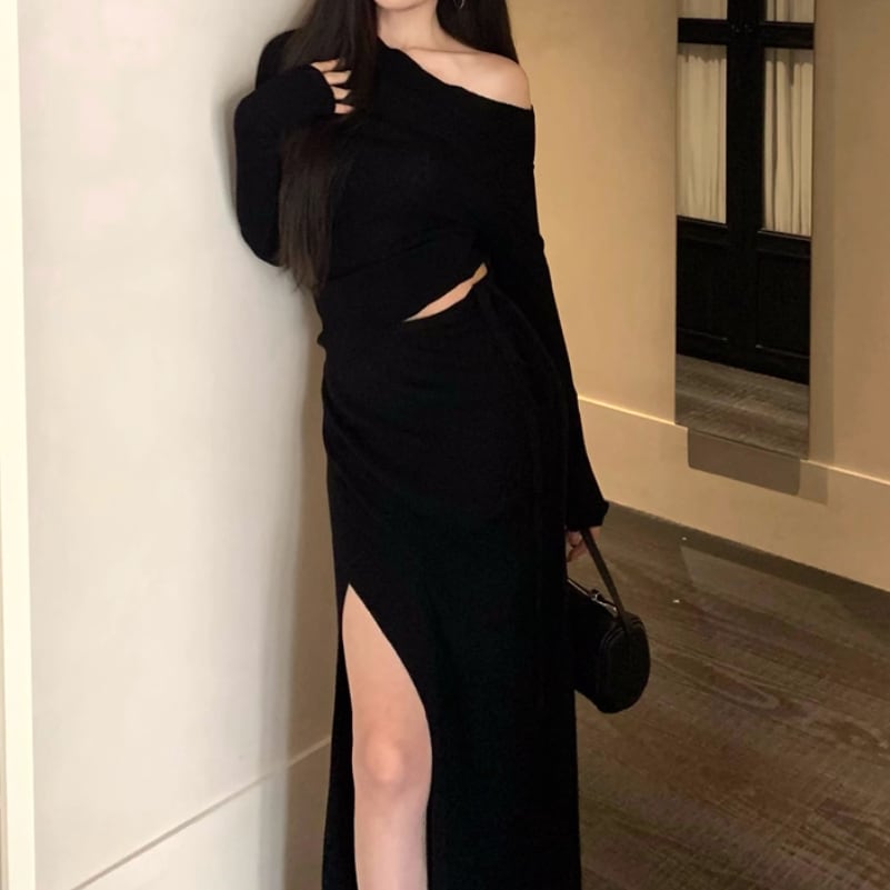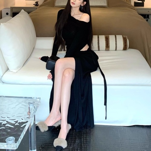 【2点セット】2色/ハイネックホルタートップス+プリーツスカート ・7456