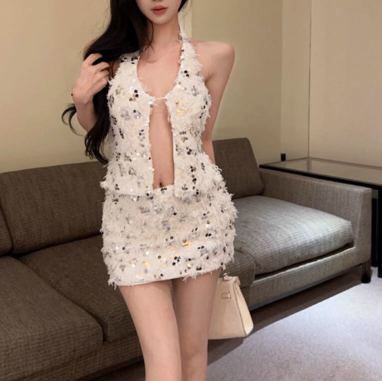 【2点セット】2色/ハイネックホルタートップス+プリーツスカート ・7456
