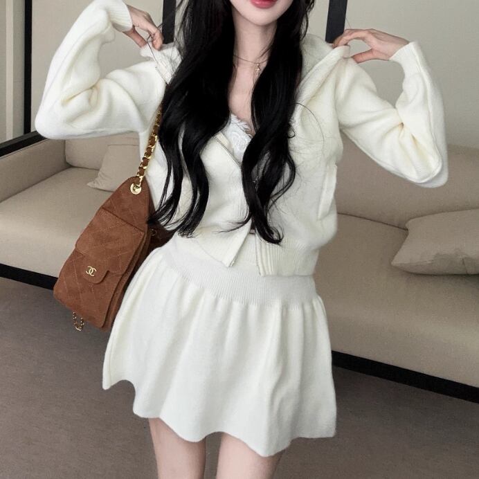 【3点セット】ファーネックカーデ+カットアウトキャミ+ロゴスカート ・13218