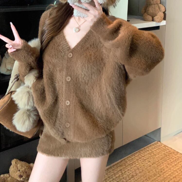 【3点セット】ファーネックカーデ+カットアウトキャミ+ロゴスカート ・13218