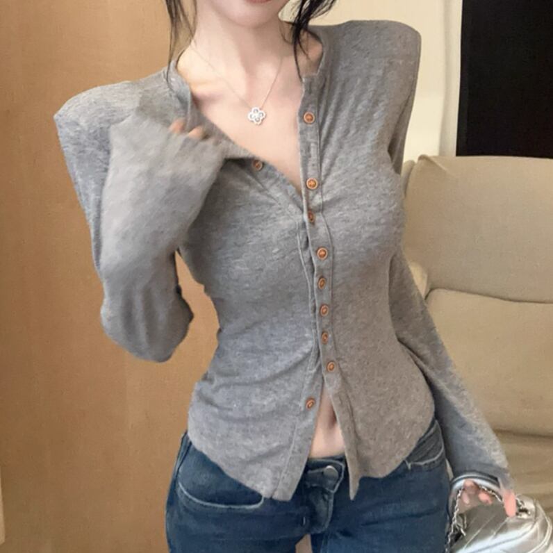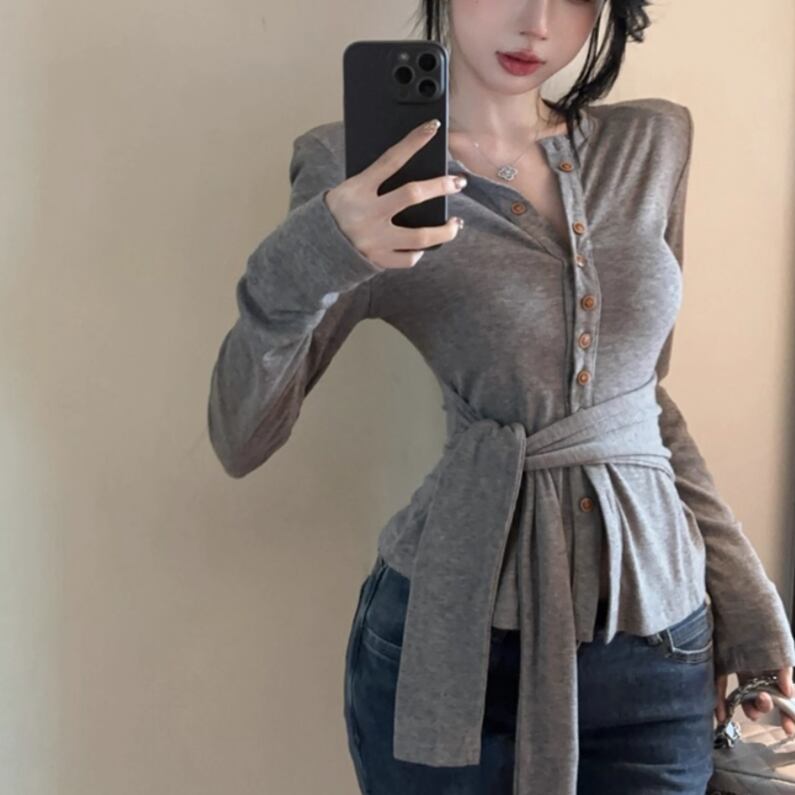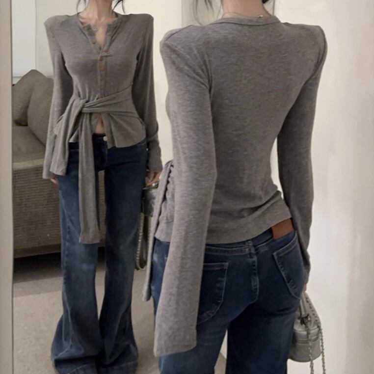 3色/カットアウトボタンハイネックトップス ・13211