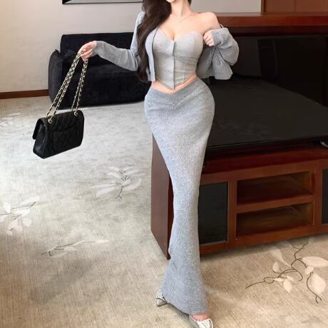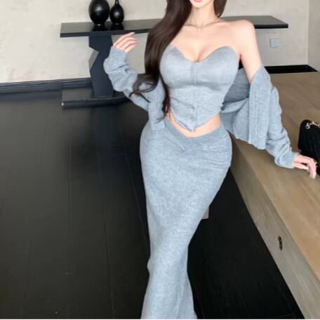 【3点セット】ファーネックカーデ+カットアウトキャミ+ロゴスカート ・13218