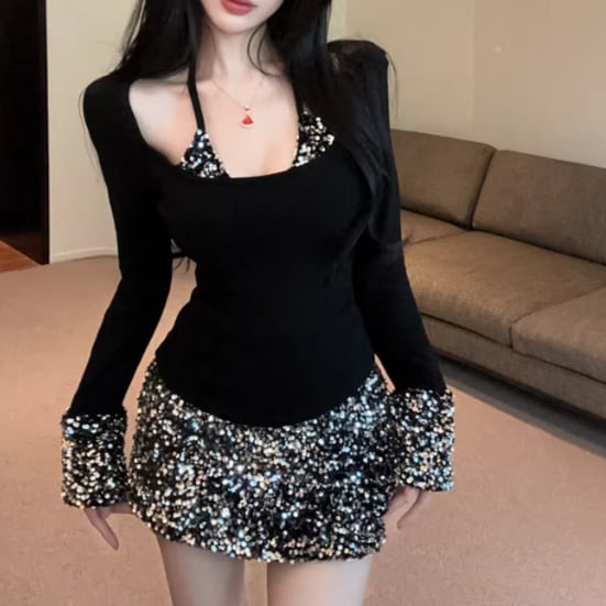 【2点セット】2色/ハイネックホルタートップス+プリーツスカート ・7456