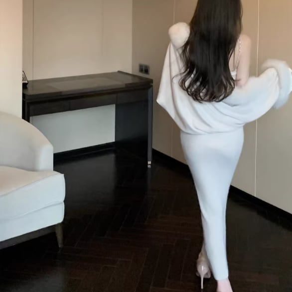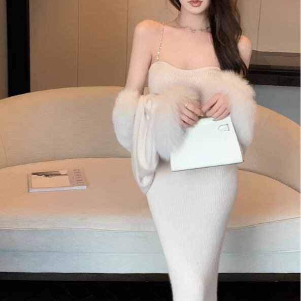 【3点セット】ファーネックカーデ+カットアウトキャミ+ロゴスカート ・13218