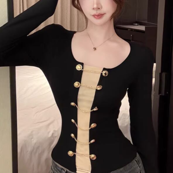 3色/カットアウトボタンハイネックトップス ・13211