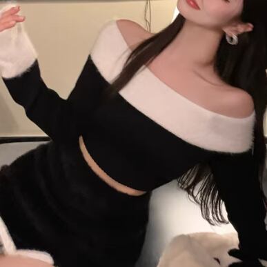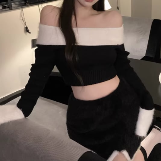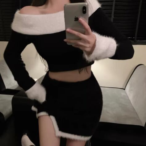 【3点セット】ファーネックカーデ+カットアウトキャミ+ロゴスカート ・13218