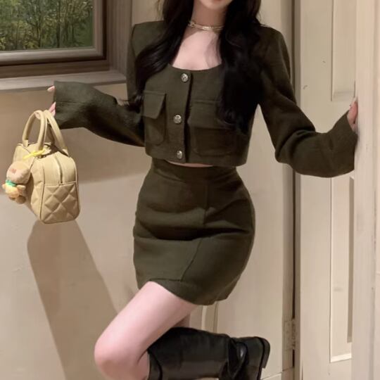 【3点セット】ファーネックカーデ+カットアウトキャミ+ロゴスカート ・13218
