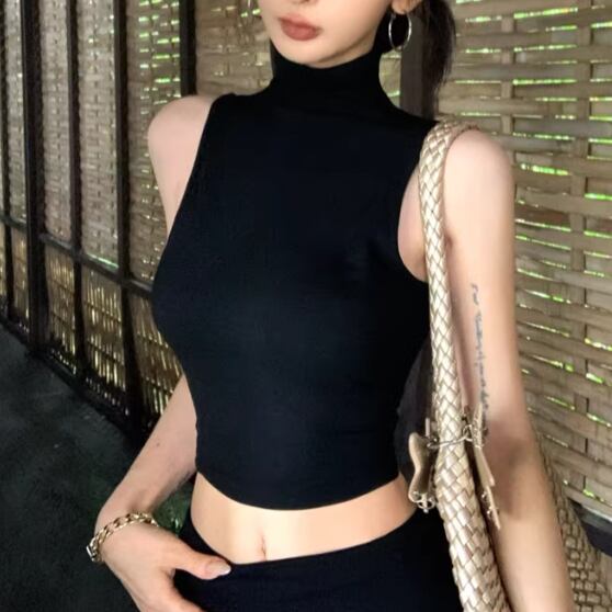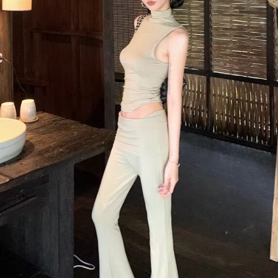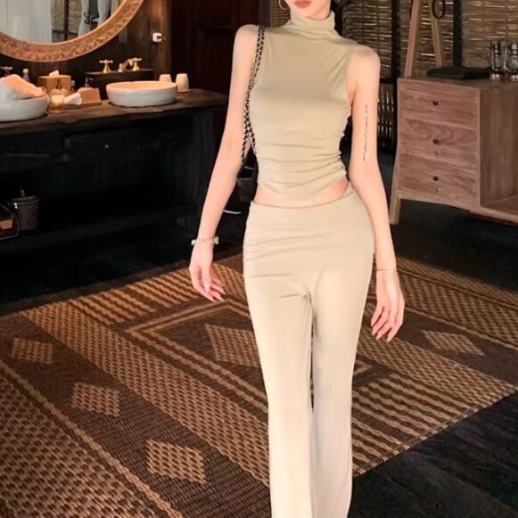 【2点セット】2色/ハイネックホルタートップス+プリーツスカート ・7456