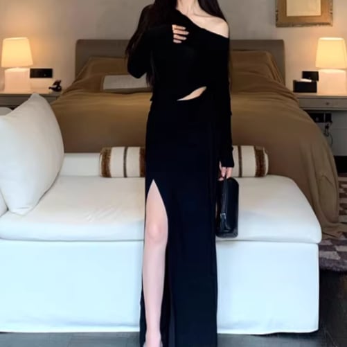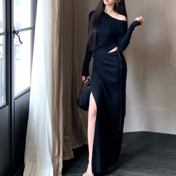 【2点セット】2色/ハイネックホルタートップス+プリーツスカート ・7456