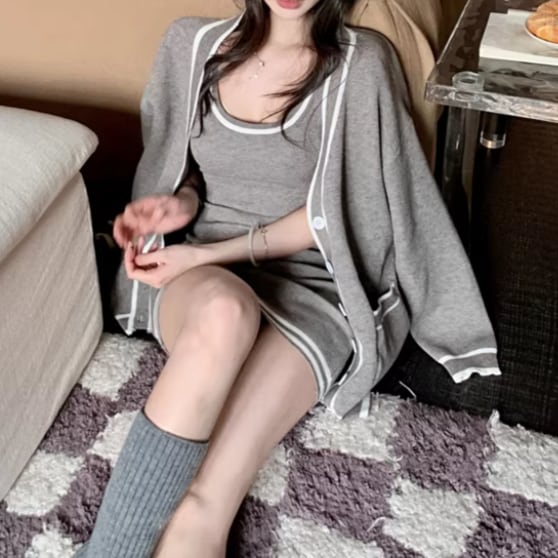 【3点セット】ファーネックカーデ+カットアウトキャミ+ロゴスカート ・13218