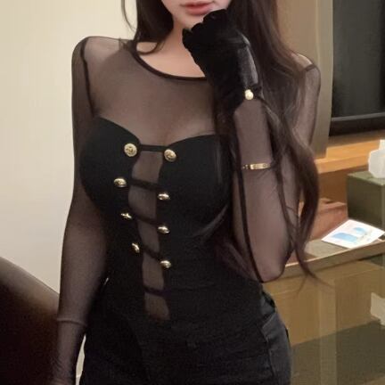 3色/カットアウトボタンハイネックトップス ・13211