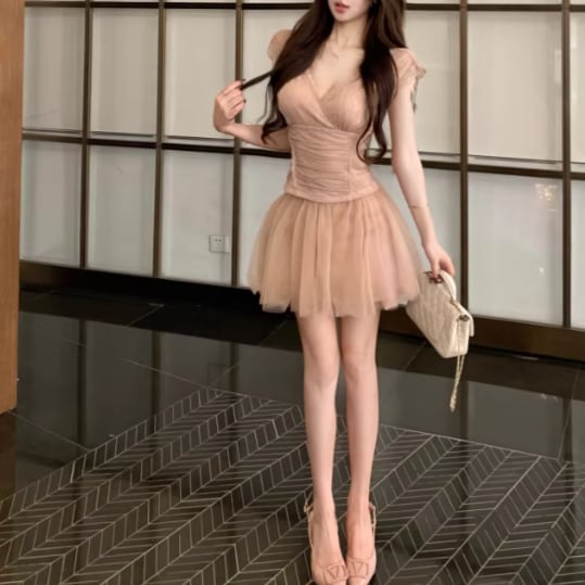 【2点セット】2色/ハイネックホルタートップス+プリーツスカート ・7456