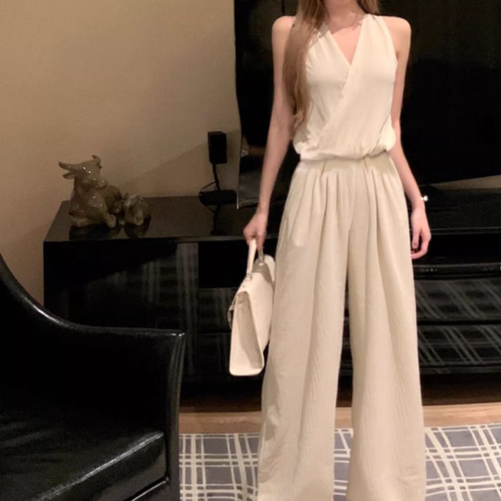 【2点セット】2色/ハイネックホルタートップス+プリーツスカート ・7456