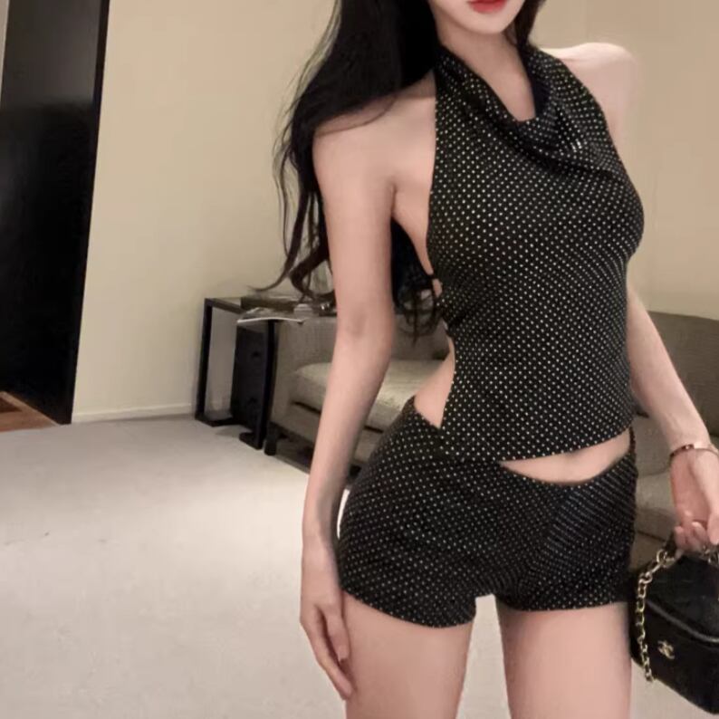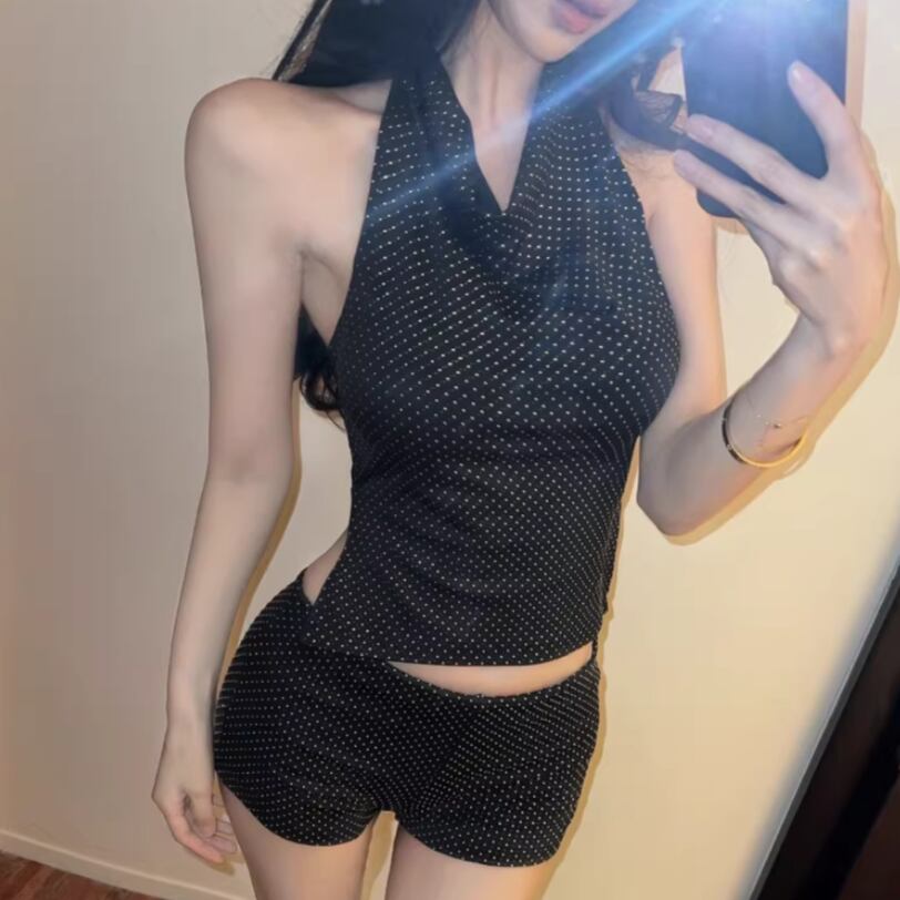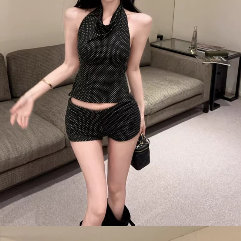 【2点セット】2色/ハイネックホルタートップス+プリーツスカート ・7456