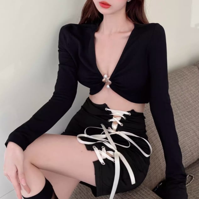 【2点セット】クロップドカーデ+スカラップトリムトップス ・12807