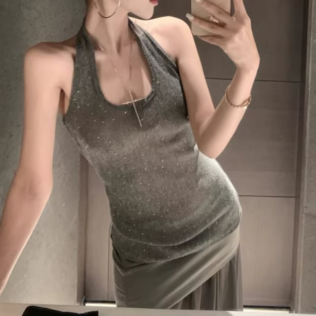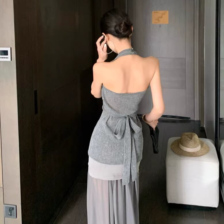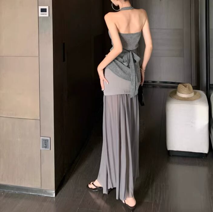 【2点セット】2色/ハイネックホルタートップス+プリーツスカート ・7456