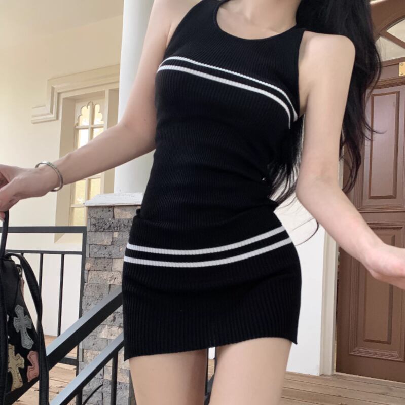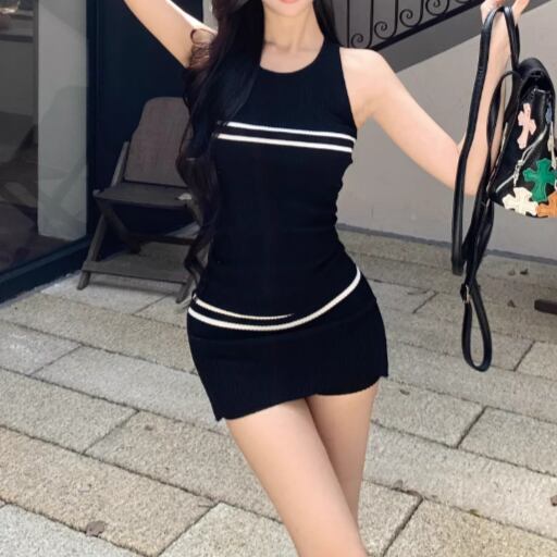 【2点セット】2色/ハイネックホルタートップス+プリーツスカート ・7456