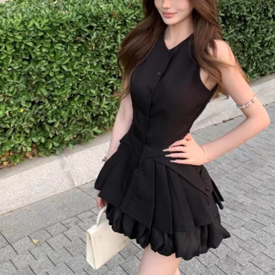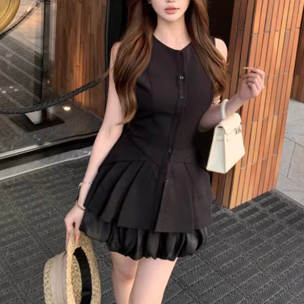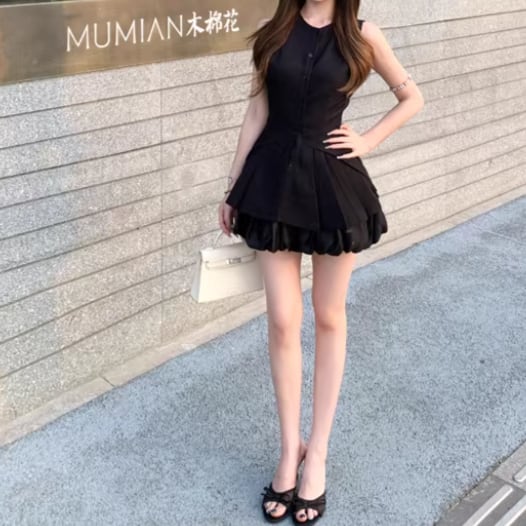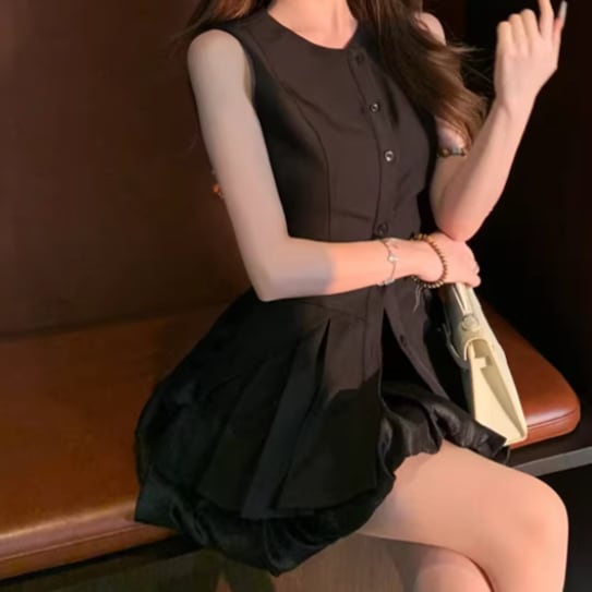【2点セット】2色/ハイネックホルタートップス+プリーツスカート ・7456