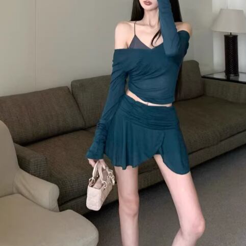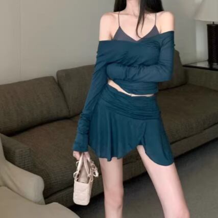【2点セット】2色/ハイネックホルタートップス+プリーツスカート ・7456