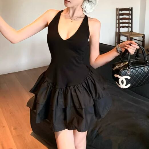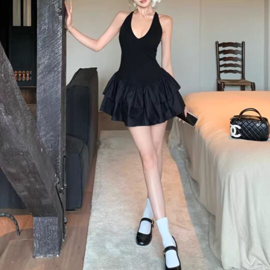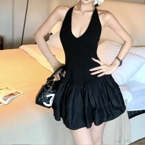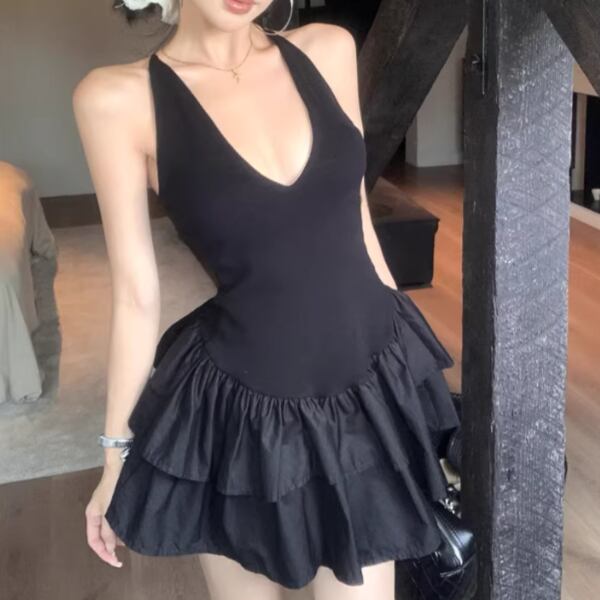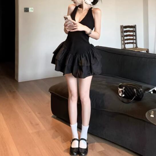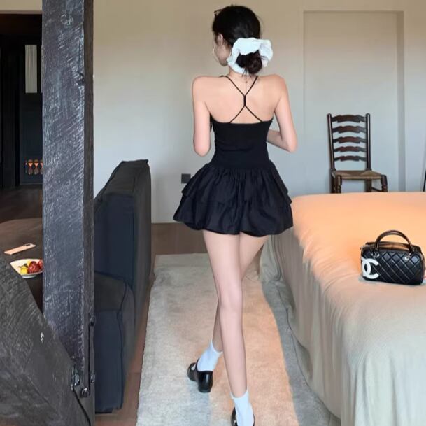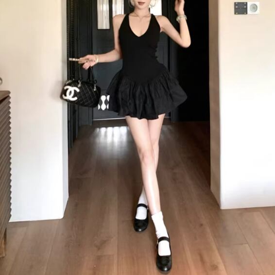【2点セット】2色/ハイネックホルタートップス+プリーツスカート ・7456