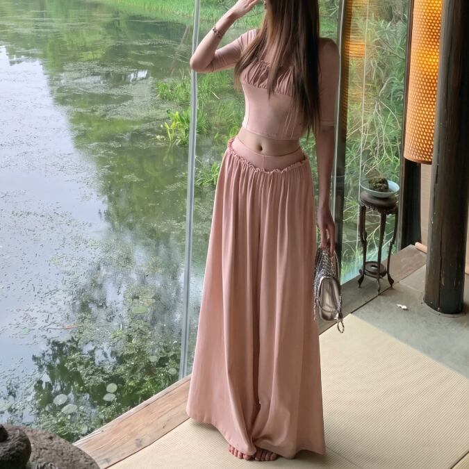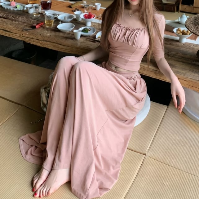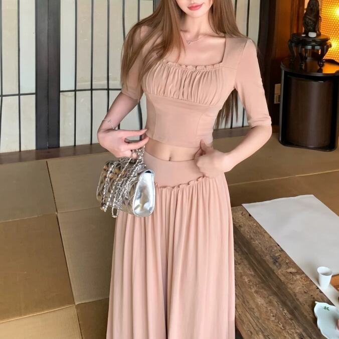 【2点セット】2色/ハイネックホルタートップス+プリーツスカート ・7456
