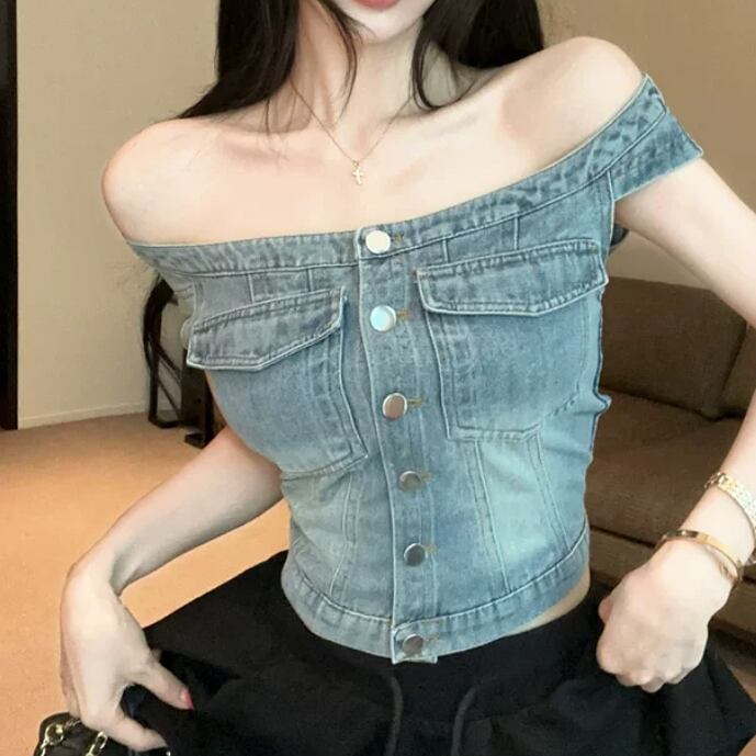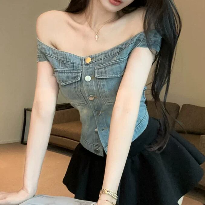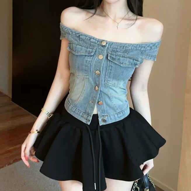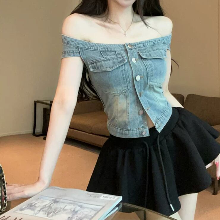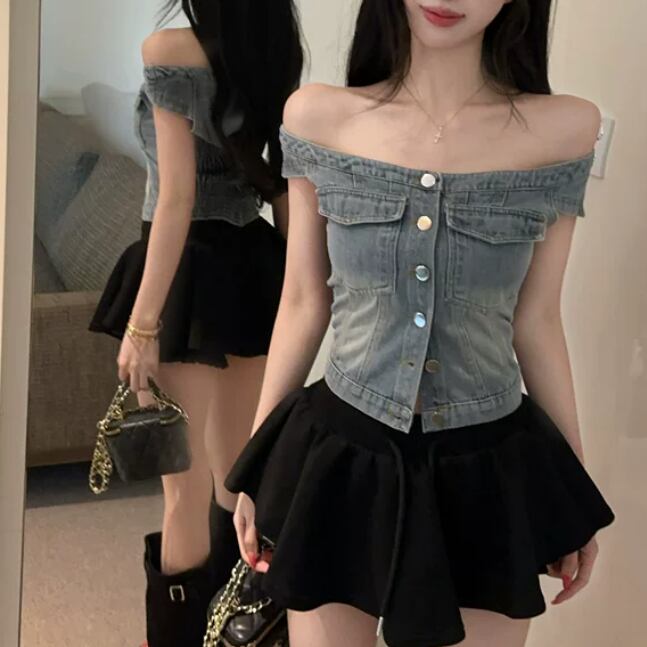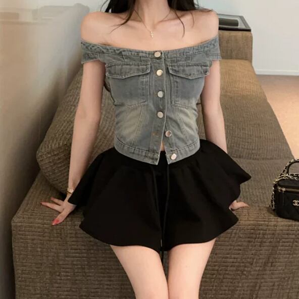 【2点セット】ハートネックベアトップ+デニムスカート ・14603