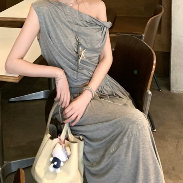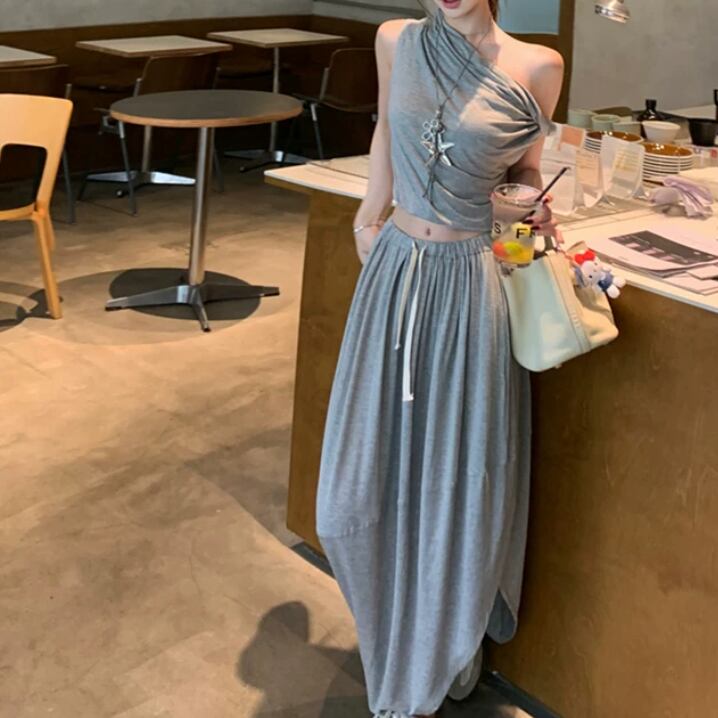 【2点セット】2色/ハイネックホルタートップス+プリーツスカート ・7456